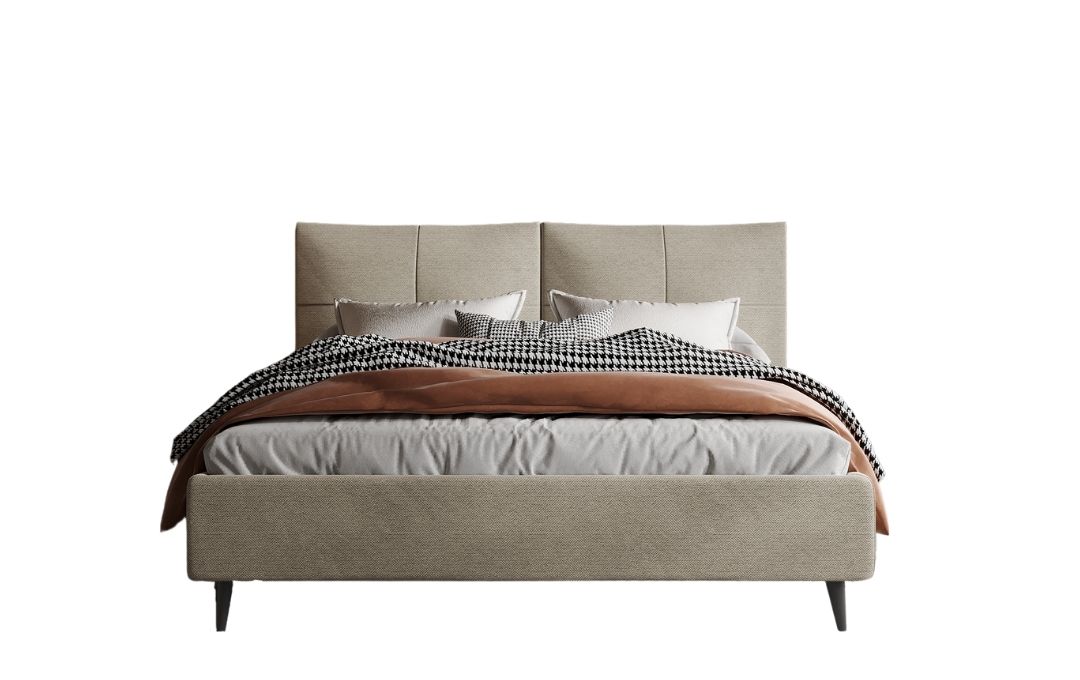 The Viola Veradea upholstered bed stands out for its elegant double-padded headboard panels, designed to enhance comfort and add a refined touch to your bedroom. The geometric stitching creates a soft, harmonious line that makes the bed both visually appealing and inviting. Every detail turns the Viola bed into a true statement piece, perfectly suited for both classic and modern interiors. This model features a spacious storage compartment to meet various needs. It comes with 13 cm high charcoal-colored plastic feet and a lift-up slatted mechanism. A wooden slatted bed base is included to ensure comfort and support.