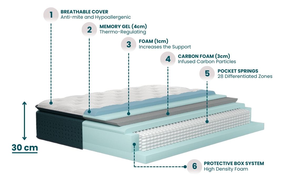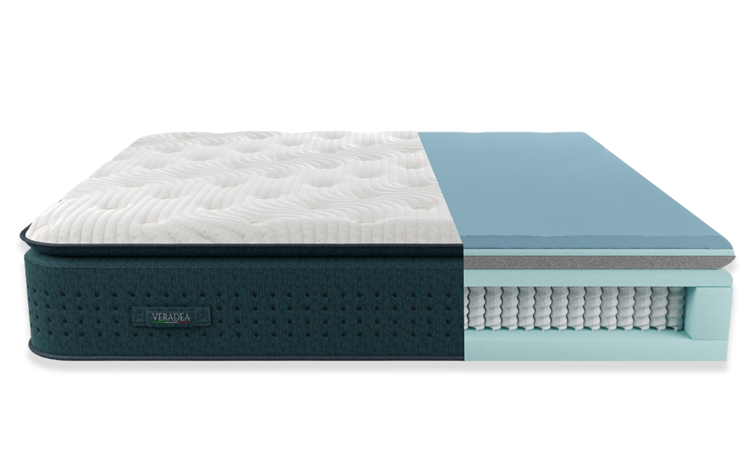 The Veradea Favoloso mattress is ideal for those who care about their comfort and prefer to sleep on a mattress with remarkable properties. A 3-layer Pillow TOP is sewn on the surface and contains a layer of thermoregulating memory gel, one of foam and one of carbon foam with carbon particles, which shield electromagnetic waves and static electricity. The pocket springs create 28 differentiated zones for maximum comfort and adaptability. 100% Made in Italy, it is a Class 1 Medical Device and is OEKO TEX 100 certified.