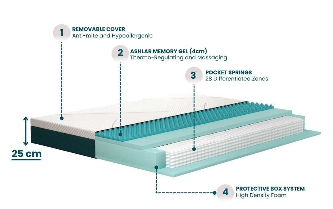 Ibrido Veradea is the hybrid pocket spring and memory gel mattress that gives an embracing support to your sleep. The single pocket springs create 28 different zones and are contained in a Foam Box System that guarantees resistance to bumps and pressure. The thermos-regulating memory gel guarantees a perfect distribution of your body heat. A Class 1 Medical Device, 100% Made in Italy, and OEKO TEX 100 certified.